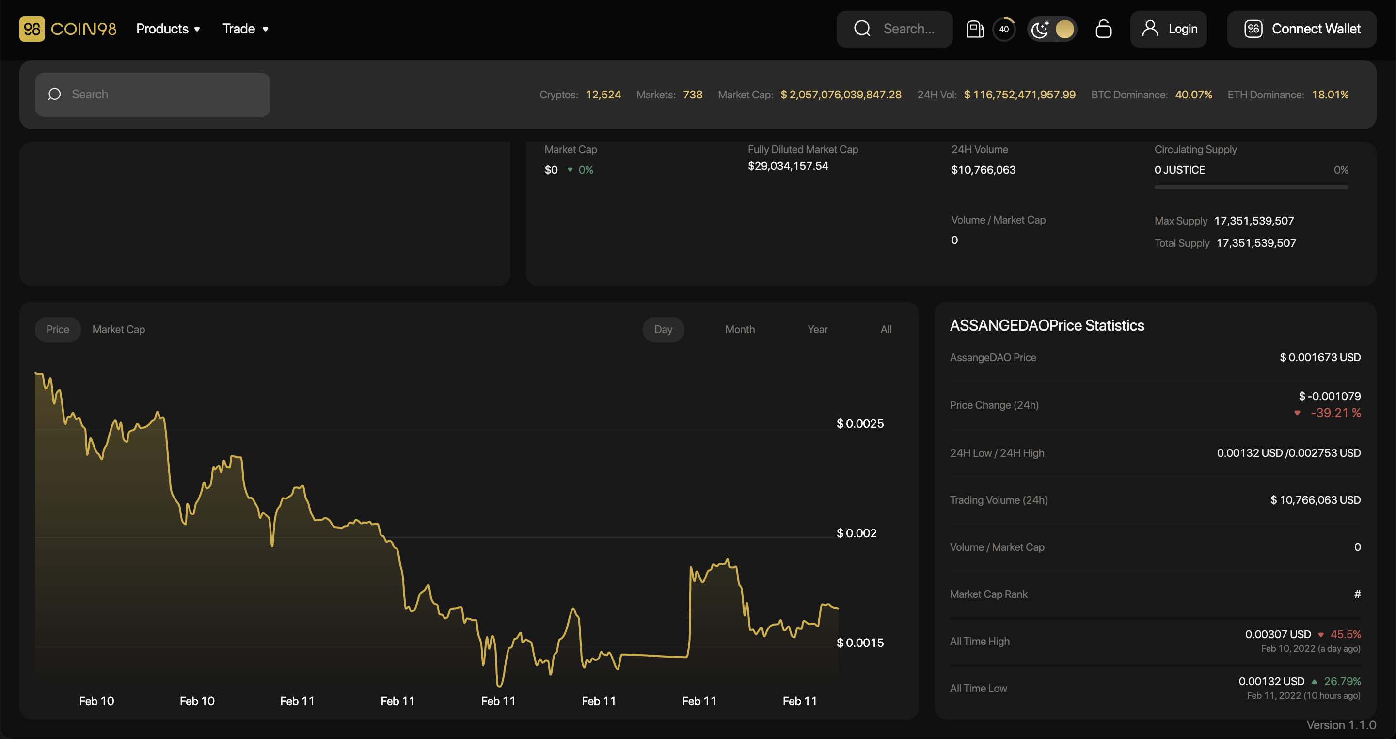 Với số tiền huy động là khoảng 54M cùng với số token là 17B JUSTICE, ta có giá JUSTICE là khoảng $0,003. Tuy nhiên, từ ngày đầu lên sàn, JUSTICE có giá cao nhất theo CoinGecko ghi nhận cũng chỉ là khoảng $0.003. Thậm chí sau đó một ngày, giá đã chia 2, chỉ còn khoảng $0.0013.