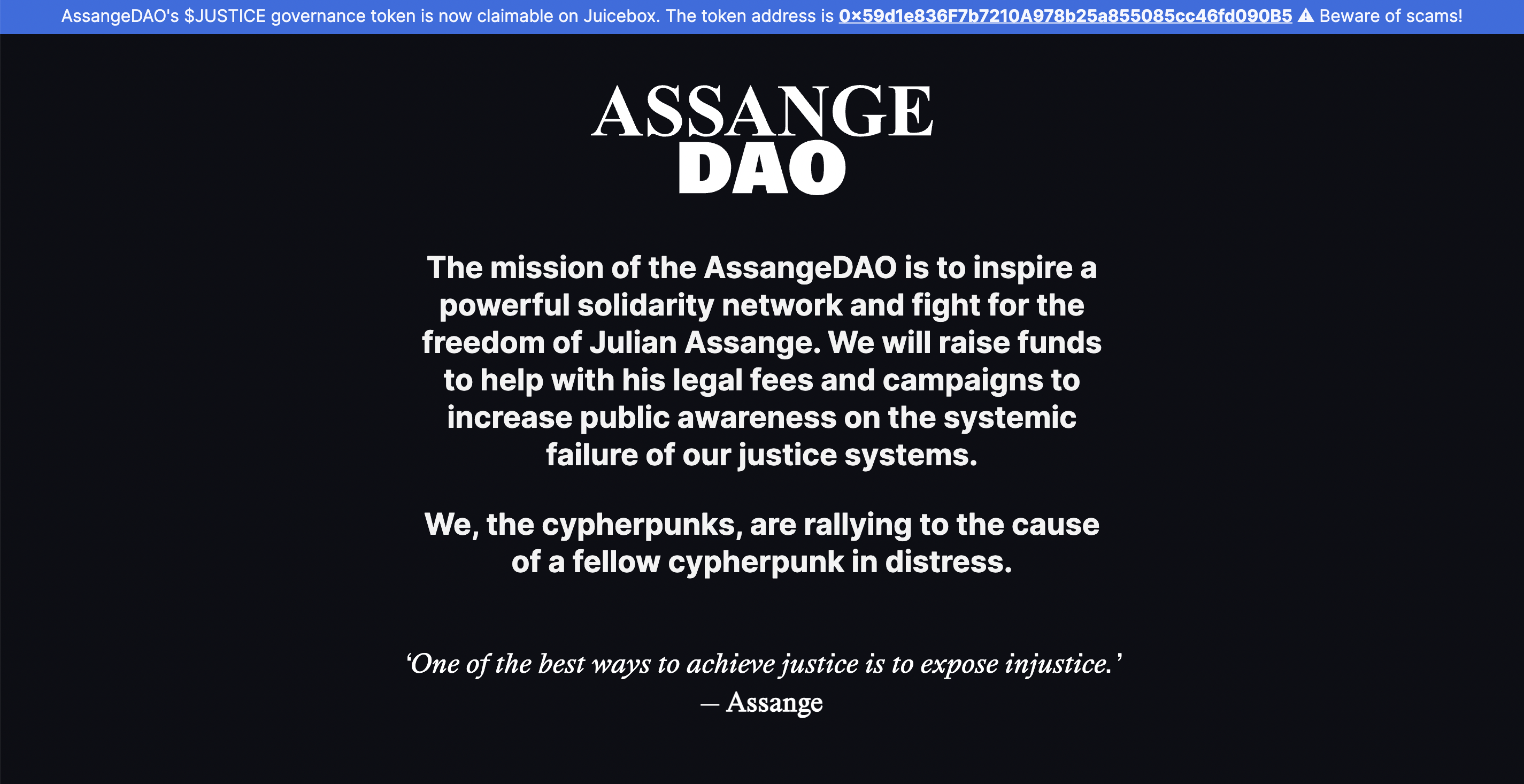 JuiceBox có vai trò tương tự với lúc xuất hiện trong chiến dịch của ConstitutionDAO, đó là phân phối token JUSTICE của AssangeDAO.