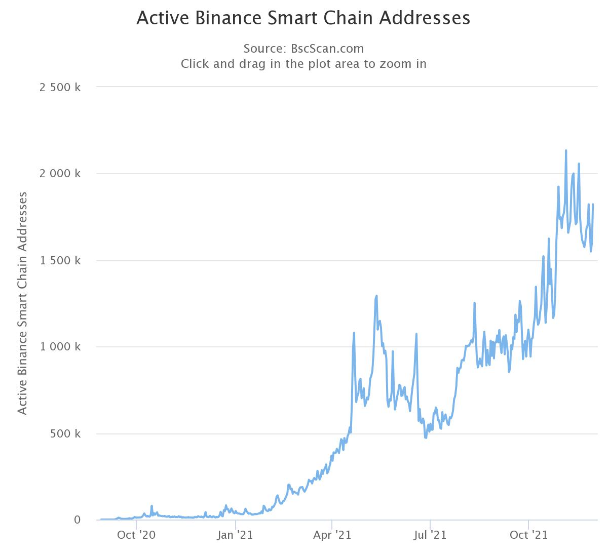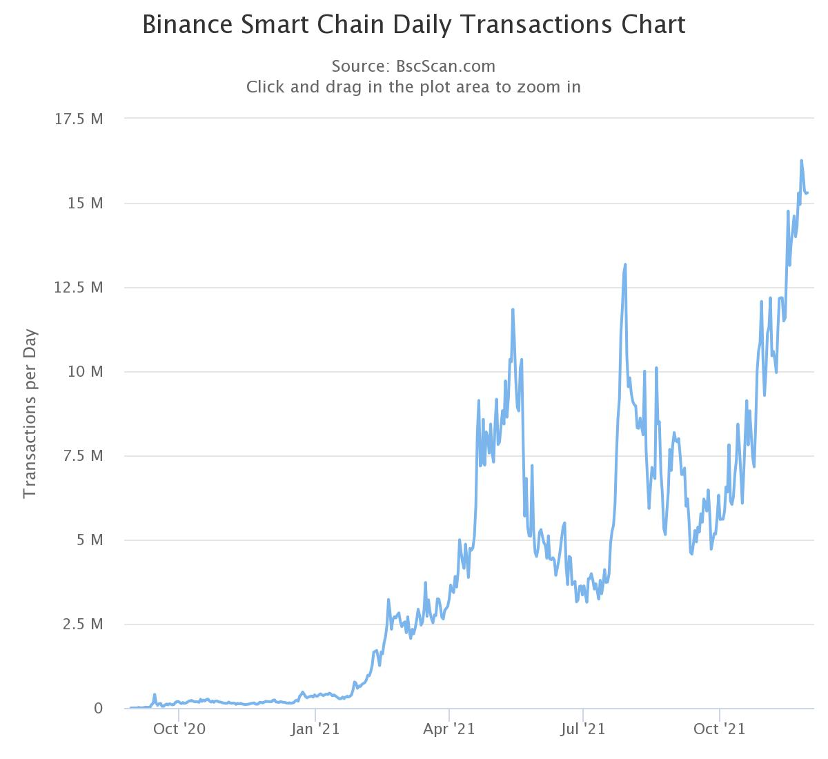 - Qua 2 biểu đồ trên, có thể thấy BNB Chain trở thành một trong những blockchain hoạt động tích cực nhất, với số lượng địa chỉ hoạt động hàng ngày luôn dao động với từ mức 1.5 cho đến 2 triệu tài khoản và với mức cao nhất là 16 triệu giao dịch được xử lý trong 24 giờ (ATH từ ngày 25 tháng 11).