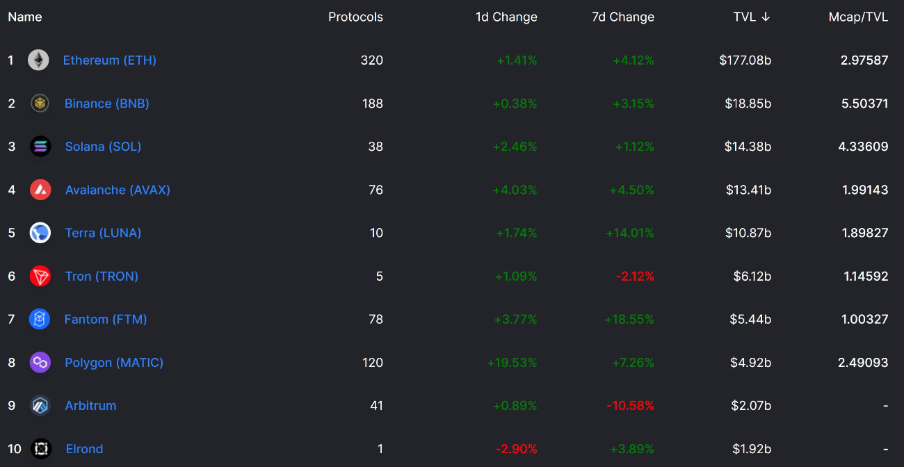 Theo DeFi Llama, BNB Chain đang là blockchain có giá trị khóa lại (TVL) cao thứ hai ngành tiền mã hóa ở mức 18,8 tỷ USD, song vẫn bị “gã khổng lồ” Ethereum bỏ xa với mức TVL lên đến 177,3 tỷ USD (cập nhật ngày 1/12/2021).