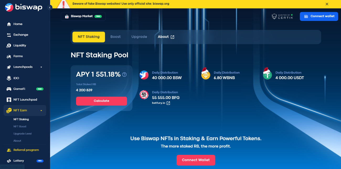 - NFT Earn: Giúp users kiếm lợi nhuận từ việc staking NFT.