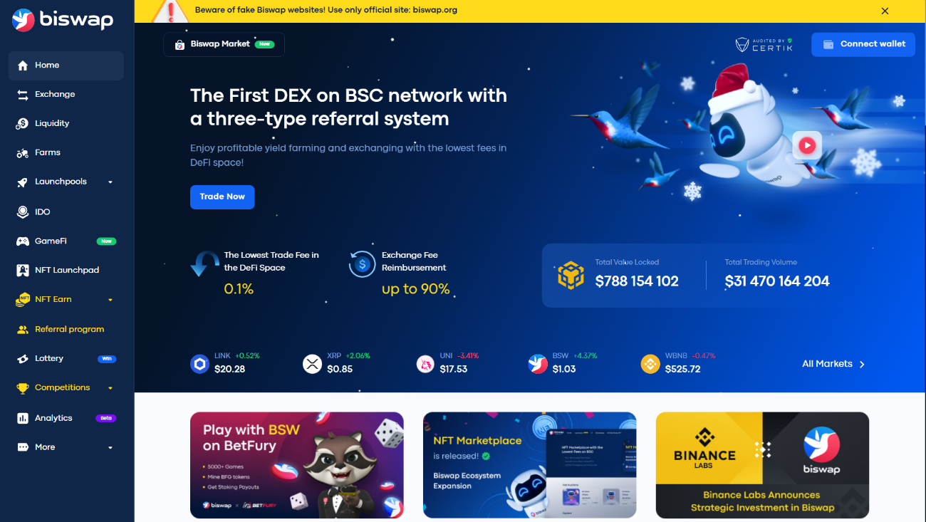Biswap là sàn giao dịch phi tập trung đầu tiên có 3 loại chương trình giới thiệu và phí giao dịch thấp 0.1%, được xây dựng trên BNB Chain và cho phép giao dịch các loại tokens chuẩn BEP-20 trong mạng lưới BSC. Các dự án Biswap đang cung cấp bao gồm: