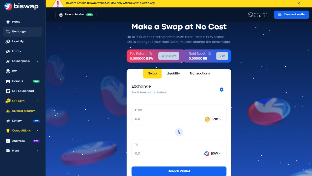 - Biswap Exchange: Giao dịch swap các tokens với phí giao dịch gần như bằng 0. Trong đó, 90% phí sẽ được hoàn trả vào số dư Return fees và 10% sẽ được hoàn lại dưới dạng Robi Boost giúp tăng sức mạnh NFT của anh em trong NFT Staking Pools.