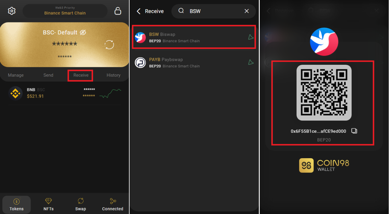Vì BSW thuộc chuẩn BEP-20 của Binance Smart Chain, anh em có thể lưu trữ trên Coin98 Wallet với thao tác đơn giản sau: