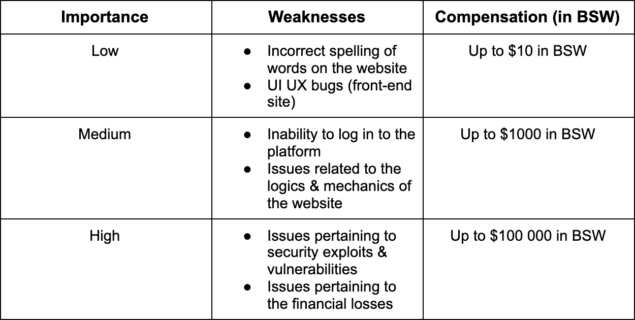 Nếu anh em để ý đến chương trình bug bounty program của Biswap. Họ rất chú trọng vấn đề chất lượng khi sẵn sàng chi phần thưởng cho những người kiếm lỗi ngay trên chính website (chẳng hạn như sai chính tả, lỗi typo) với khoảng $10 bằng BSW.