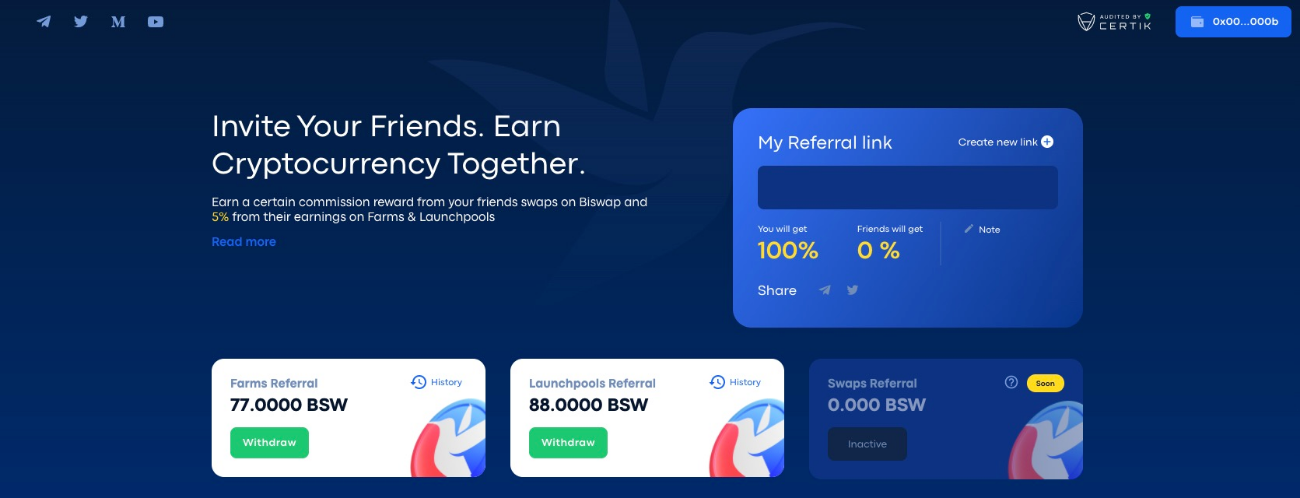- Referral Commission: Nhận 5% từ thu nhập của bạn bè trong Biswap Farm & Launchpool dưới dạng token BSW.