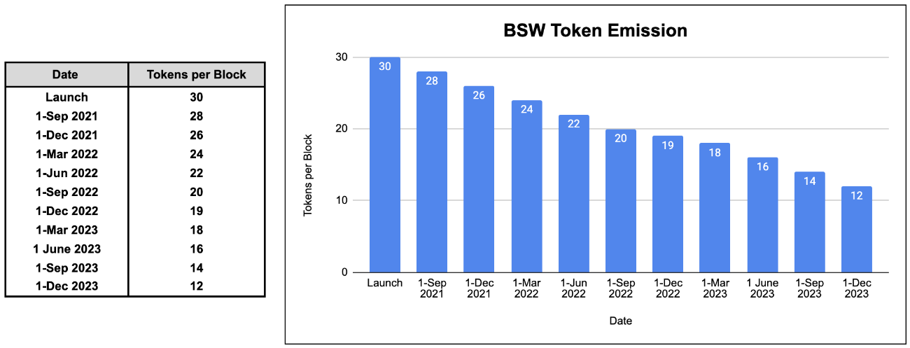 (*): Tổng cung của BSW sẽ bị đốt đi và giảm phát để tăng giá trị nội tại cho tokens và khuyến khích người dùng nắm giữ BSW. Số lượng BSW sẽ bị burn 2 lần 1 tháng bắt đầu từ tháng 6/2021.