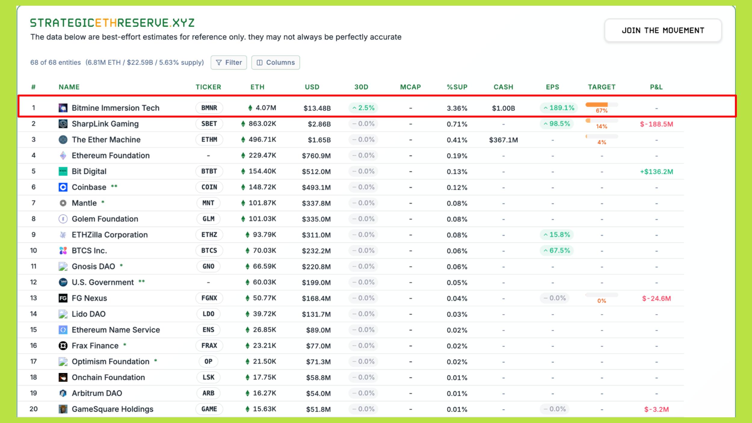 Tính đến thời điểm gần nhất, Bitmine đang nắm giữ khoảng 4.07 triệu ETH, tương đương xấp xỉ 3.4% tổng nguồn cung Ethereum đang lưu hành trên thị trường. Quy mô này đưa Bitmine vào nhóm những tổ chức sở hữu ETH lớn nhất toàn cầu, vượt xa vai trò của một nhà đầu tư tài chính thông thường.