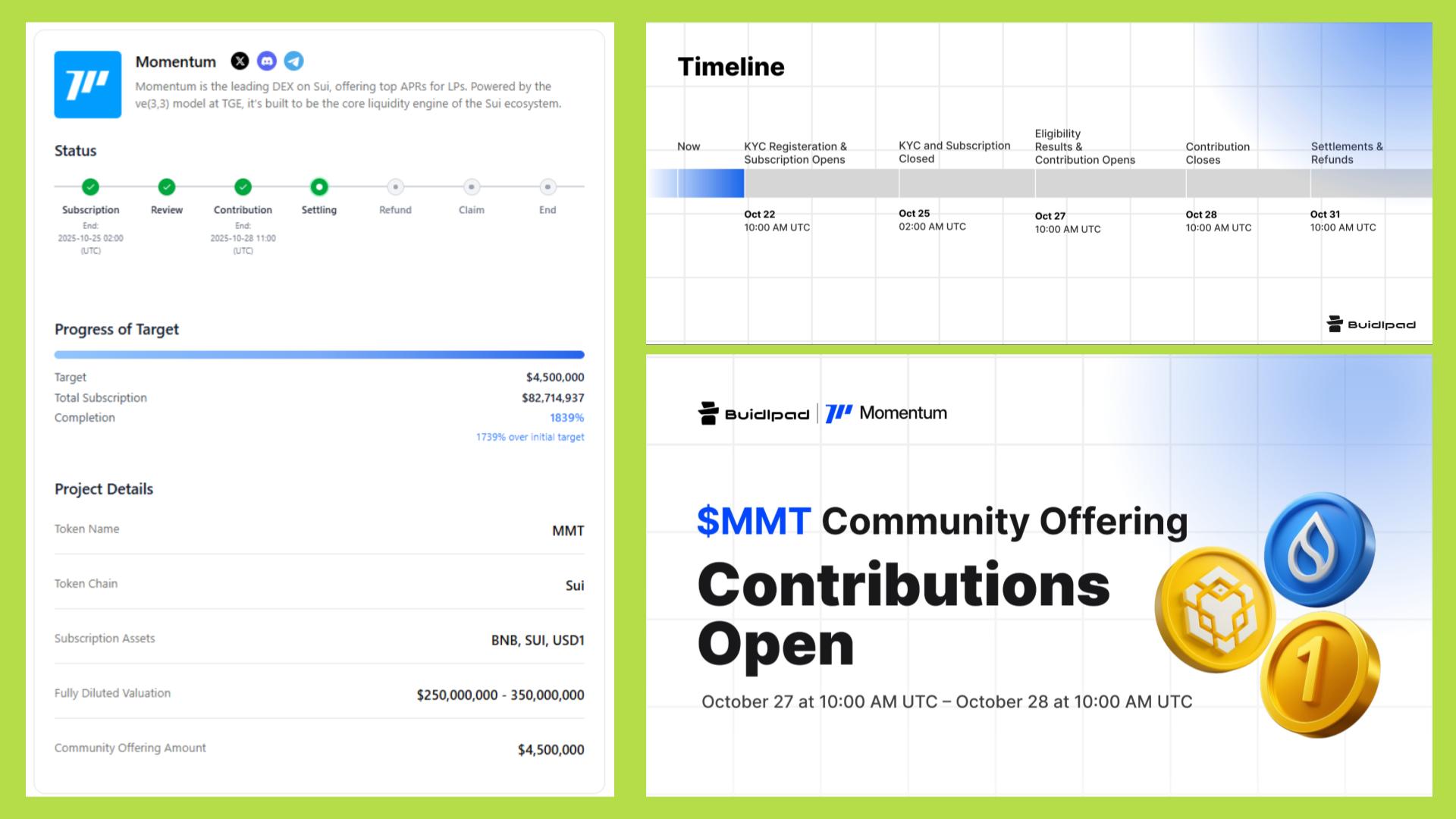 - Momentum Finance (MMT): Đang trong giai đoạn chuẩn bị sale. Buidlpad mở KYC & đăng ký ngày 22/10/2025 cho đợt community sale. Điều kiện tham gia liên quan đến staking trên HODL. (FDV 250 triệu USD cho người staking ≥ 3,000 USD Momentum LP; FDV 350 triệu USD cho nhóm khác)