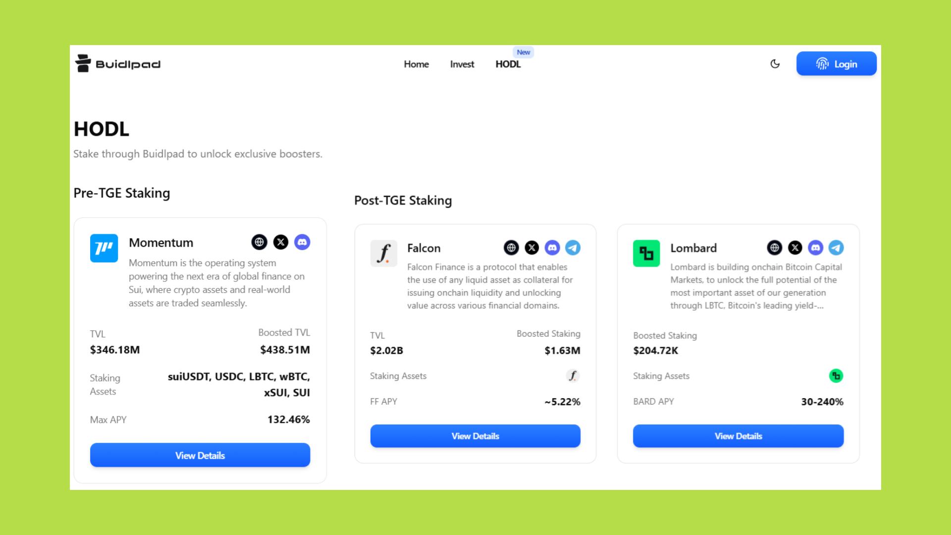 Hệ thống được gọi là Buidlpad HODL: người dùng có thể stake (gửi) các tài sản được hỗ trợ (stablecoin, token, LP token) vào các pool được Buidlpad phối hợp với đối tác. Ví dụ: người dùng có thể stake USDC, SUI, wBTC, xSUI trong chiến dịch Pre-TGE HODL cùng dự án Momentum.