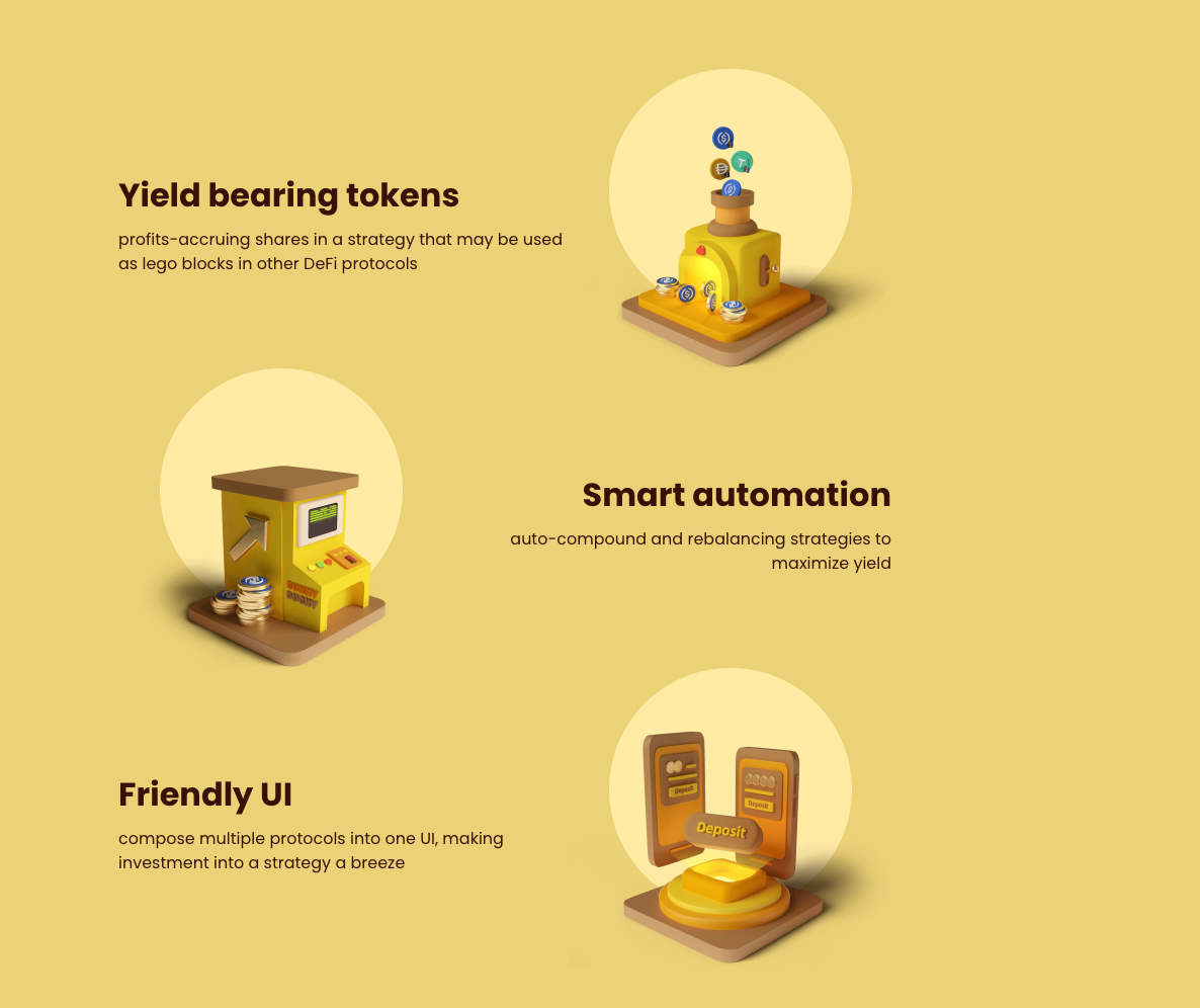 Khi sử dụng tính năng Yield tokens là chúng tự động tăng giá trị khi yield pool được gộp lại (compound), sẽ làm cho lợi tức tăng lên và lý tưởng hoá cho việc vay thế chấp, vì khi khối lượng nợ giảm xuống thì khoản vay sẽ tự hoàn trả.