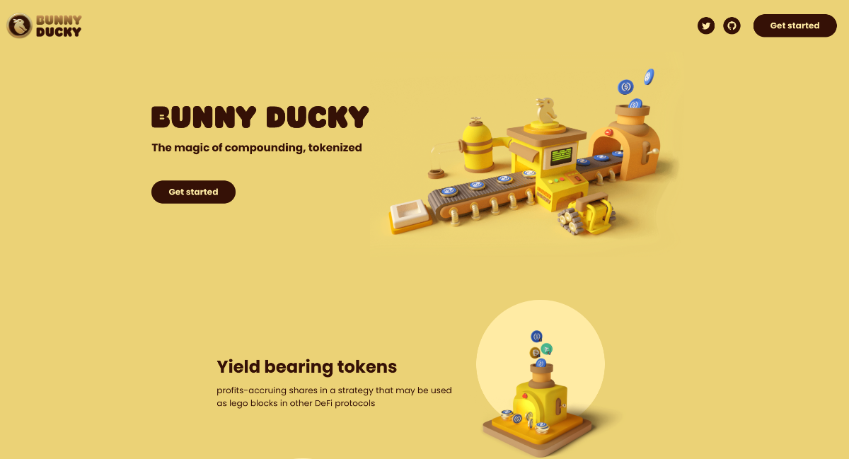 Bunny Ducky là một nền tảng Tokenizing DeFi strategies (mã hoá chiến lược trong DeFi) dưới dạng yield bearing token, tận dụng lãi kép và mang lại lợi nhuận cho người dùng.