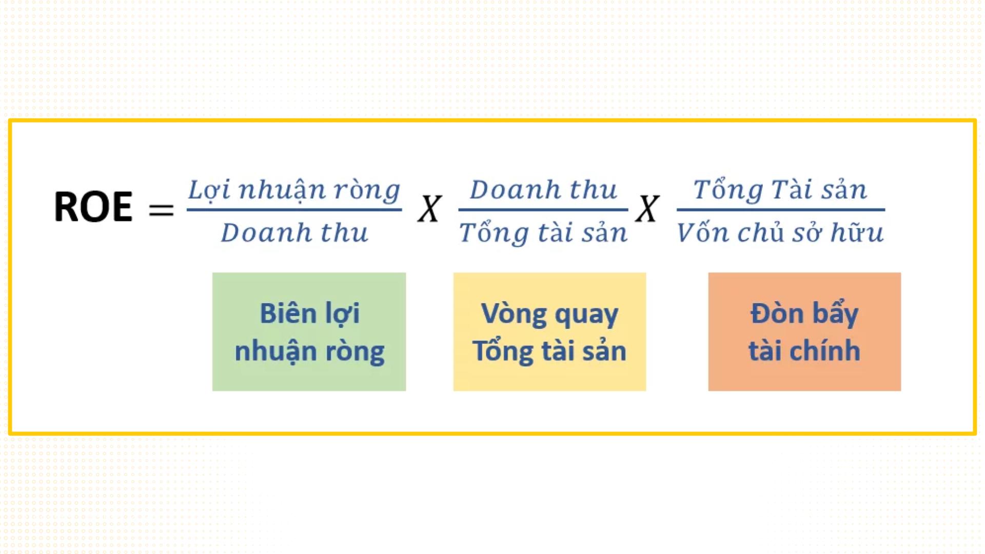 Ở mức phân tích sâu hơn, ROE thường được tách thành ba cấu phần theo mô hình DuPont: biên lợi nhuận ròng, vòng quay tài sản và đòn bẩy tài chính.