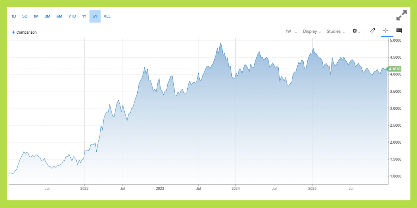 Đợt tăng mạnh cuối 2023 - đầu 2024 trùng với kỳ vọng FED kết thúc chu kỳ thắt chặt. Lợi suất trái phiếu Mỹ kỳ hạn 10 năm giảm từ quanh 5% xuống dưới 4.2%, và Bitcoin phản ứng gần như đồng thời với các tài sản rủi ro truyền thống, đặc biệt là cổ phiếu công nghệ.