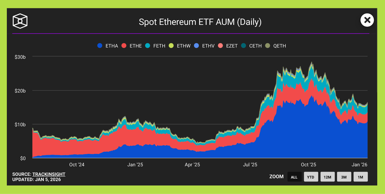 Khoảng cách này càng rõ khi nhìn sang các ETF crypto khác. Sau Bitcoin, Ethereum có ETF giao ngay từ 7/2024, nhưng đến cuối 2025 AUM chỉ quanh 20-25 tỷ USD, có lúc giảm dưới 20 tỷ - chưa tới 1/4 quy mô ETF Bitcoin. Quan trọng hơn, dòng tiền vào ETF Ethereum mang tính gián đoạn, chủ yếu phục vụ đầu cơ ngắn hạn, chưa thể hiện vai trò phân bổ chiến lược dài hạn như Bitcoin.