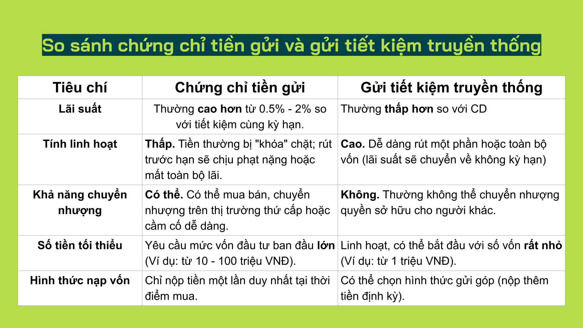 Dù đều là những công cụ gửi tiền tại ngân hàng nhằm mục đích sinh lời và bảo toàn vốn, Chứng chỉ tiền gửi (CD) và Gửi tiết kiệm truyền thống có những đặc tính riêng biệt phù hợp với từng nhu cầu tài chính khác nhau.