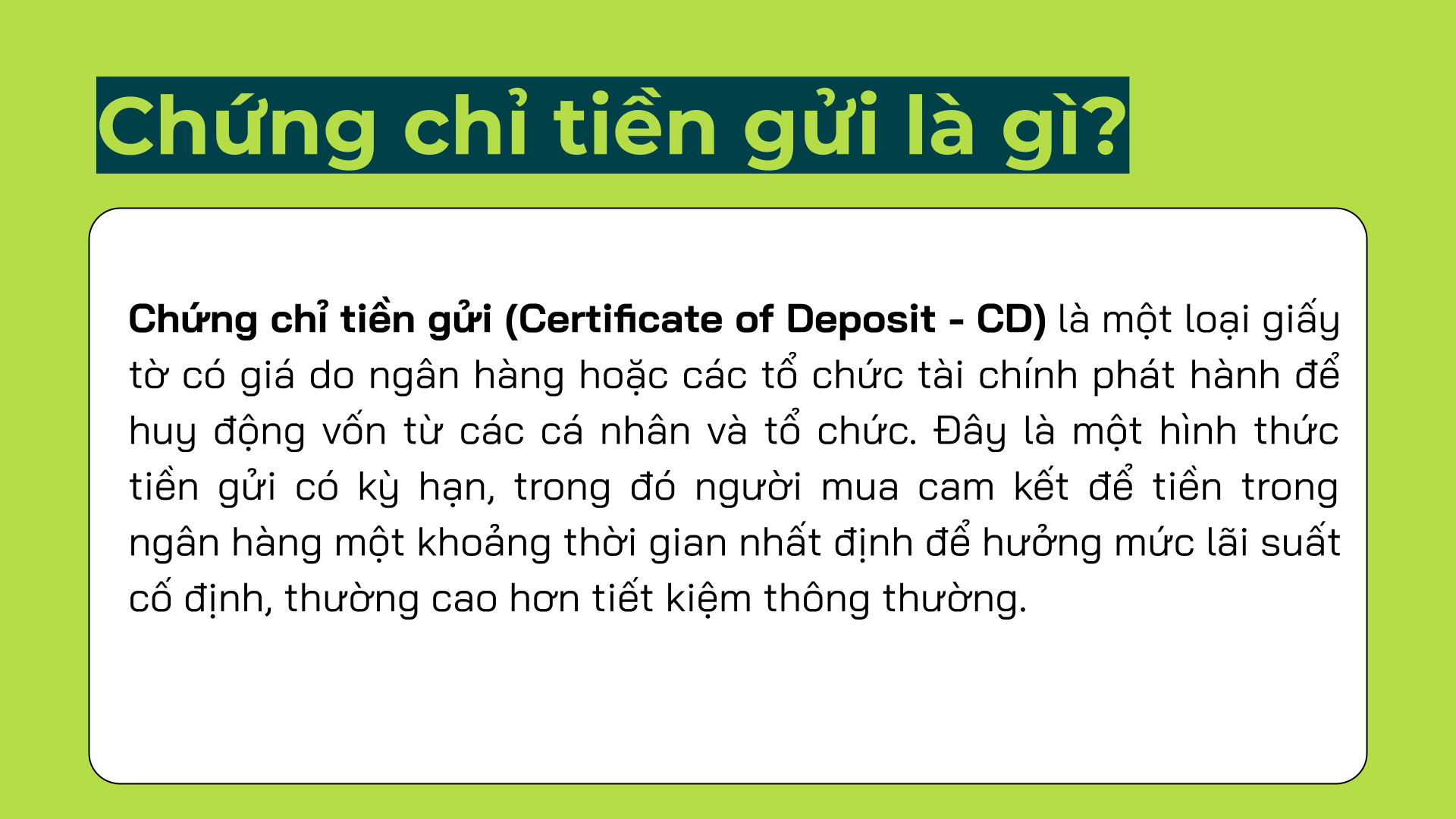 Chứng chỉ tiền gửi (Certificate of Deposit - CD) là một loại giấy tờ có giá do ngân hàng hoặc các tổ chức tài chính phát hành để huy động vốn từ các cá nhân và tổ chức. Đây là một hình thức tiền gửi có kỳ hạn, trong đó người mua cam kết để tiền trong ngân hàng một khoảng thời gian nhất định để hưởng mức lãi suất cố định, thường cao hơn tiết kiệm thông thường.