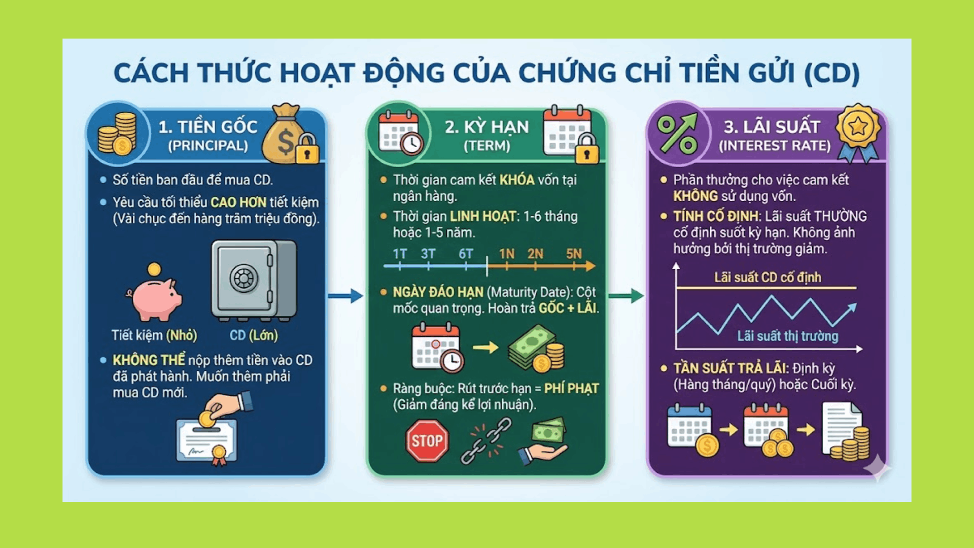 Đổi lại, ngân hàng sẽ trả cho bạn một mức lợi nhuận cao hơn so với các loại hình tiết kiệm thông thường. Cơ chế vận hành của CD được định nghĩa chặt chẽ qua 3 yếu tố cốt lõi sau:
