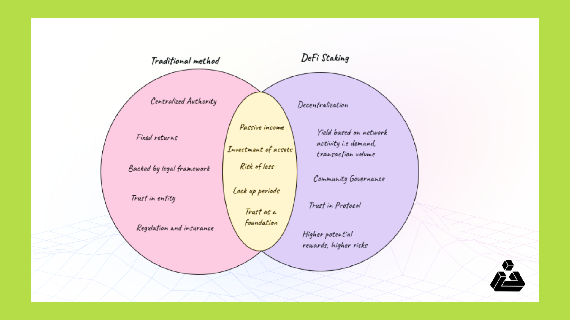 - Staking: Dựa trên sự bảo chứng của thuật toán và Smart Contract. Tài sản của bạn được quản lý bởi các dòng mã code. Rủi ro ở đây không nằm ở thể chế mà nằm ở lỗi bảo mật (hacker), lỗ hổng Smart Contract hoặc sự sụp đổ của giao thức. Đây là niềm tin đặt vào công nghệ.