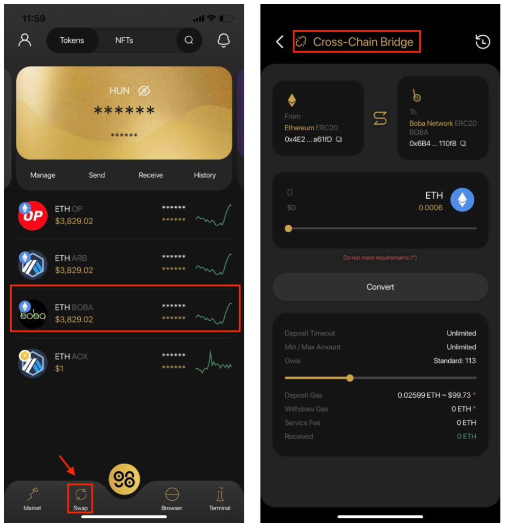 Đầu tiên, các bạn mở Coin98 Wallet App, truy cập vào ví Ethereum, sau đó chọn token muốn chuyển qua Boba Network và chọn Cross-Chain Bridge (Ethereum <> Boba Network).