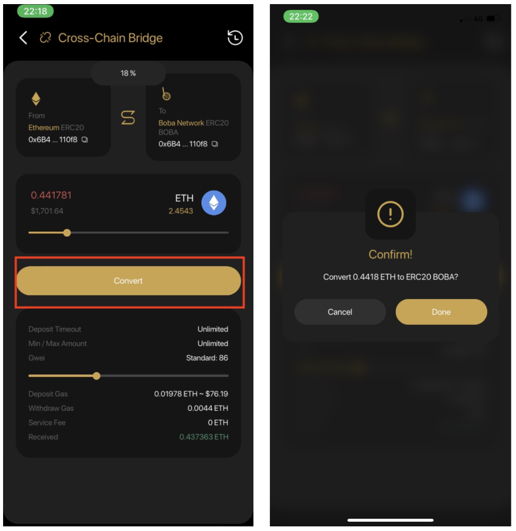 Tiếp theo, nhập số lượng token mà bạn muốn chuyển sang Boba Network. Sau đó, nhấp vào “Convert”, Coin98 Wallet sẽ hiện lên một tin nhắn như hình bên phải, nếu thông tin không có gì sai sót, bạn cần nhấp “Done” để hoàn thành chuyển đổi.