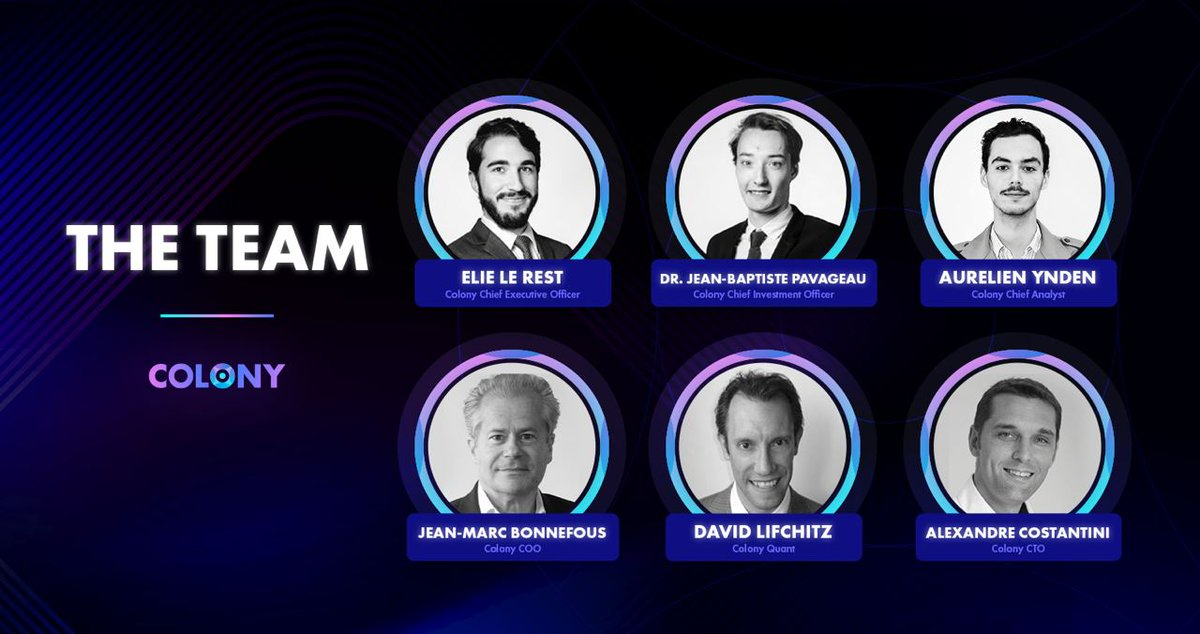 Đội ngũ phát triển dự án Colony bao gồm những thành viên với nhiều năm kinh nghiệm trong lĩnh vực đầu tư và quản lý tài sản. Đa số các thành viên trong đội ngũ đền từ quỹ ExoAlpha, một quỹ đầu tư chuyên về các tài sản điện tử, với volume giao dịch hàng tháng lên tới gần nửa tỷ đô la.