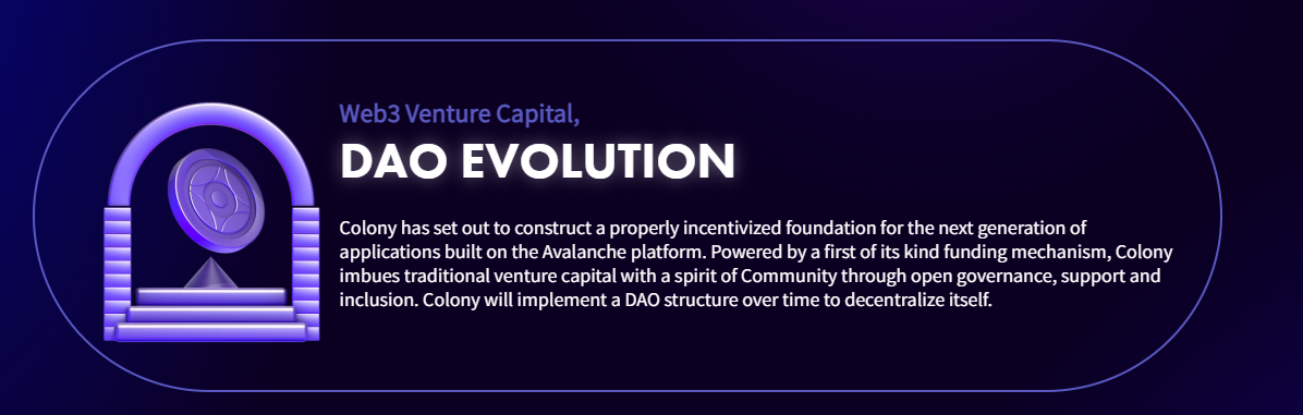 Colony sẽ đầu tư vào các dự án mới ở trên hệ sinh thái Avalanche, hỗ trợ về mặt tài chính và giúp đỡ dự án phát triển. Đội ngũ phát triển dự án, những chuyên gia trong lĩnh vực quản lý tài sản, sẽ trực tiếp kiểm soát quá trình chọn lọc và đầu tư vào các dự án.