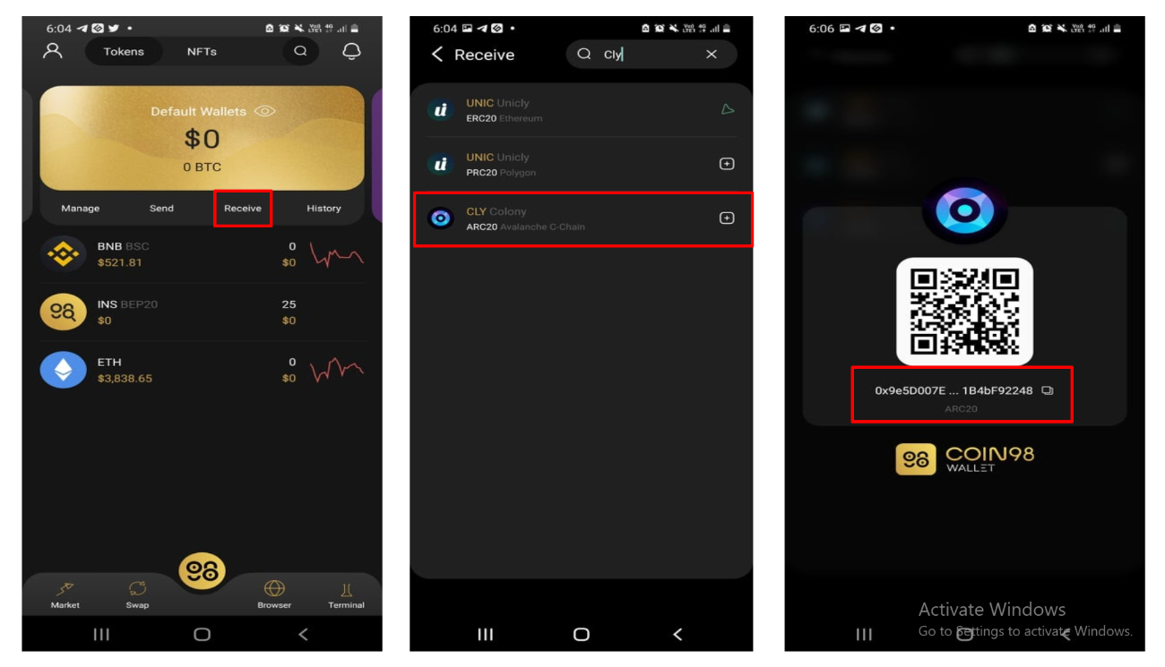 Vì CLY là token thuộc chuẩn ARC-20 của Avalanche nên sẽ được lưu trữ trên Coin98 Wallet theo các bước sau: