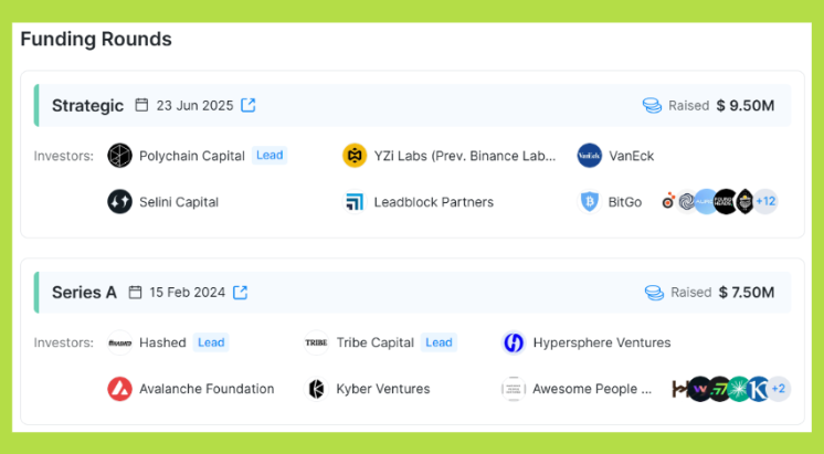 Tiếp theo, vào tháng 6/2025, Blueprint Finance công bố vòng gây quỹ 9.5 triệu USD do Polychain Capital dẫn dắt, với sự tham gia của YZi Labs (trước đây là Binance Labs) và nhiều đối tác khác như VanEck, Selini Capital, Portal Ventures, Auros, Halo Capital, LeadBlock Bitpanda Ventures, BitGo, Gate Ventures và nhiều quỹ đầu tư tổ chức khác. Tổng vốn huy động đến thời điểm đó đạt hơn 17 triệu USD.