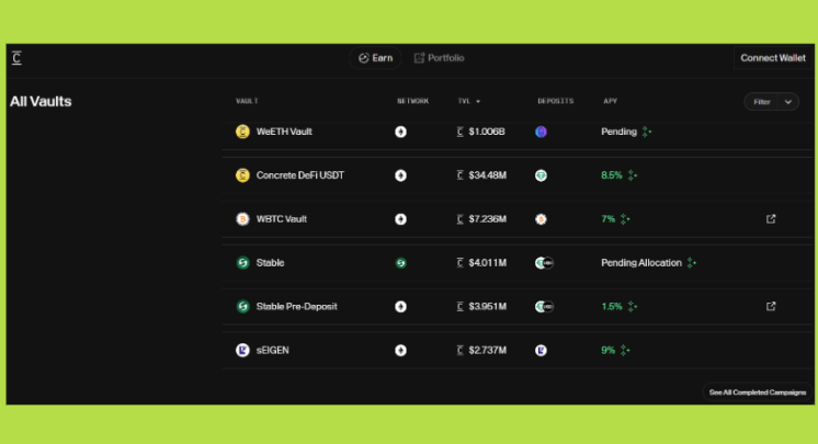 Concrete Earn là lớp sản phẩm trực tiếp kết nối người dùng với các cơ hội tạo lợi nhuận trong DeFi. Thay vì để người dùng tự lựa chọn chiến lược, theo dõi thị trường và tái cân bằng vốn, Concrete Earn đóng vai trò trung gian, gom toàn bộ sự phức tạp đó về phía giao thức.
