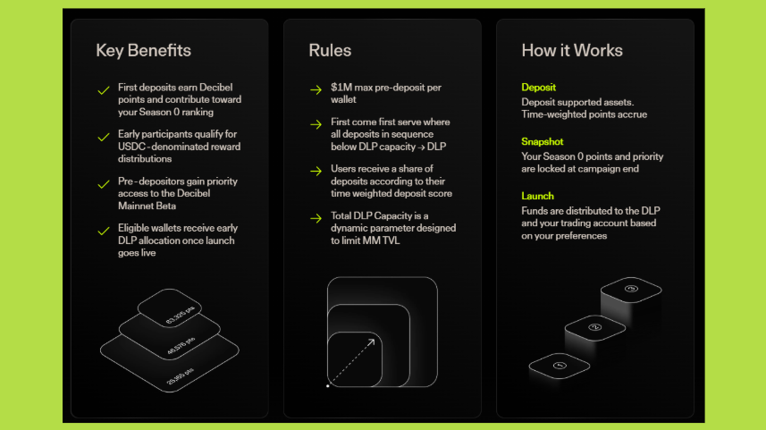 Những người tham gia pre-deposit được xem là nhóm người dùng lõi đầu tiên của Decibel, có khả năng nhận các quyền lợi trong hệ sinh thái như điểm thưởng, ưu đãi phí giao dịch, quyền truy cập sớm vào sản phẩm hoặc phân bổ liên quan đến token trong tương lai (nếu được triển khai).
