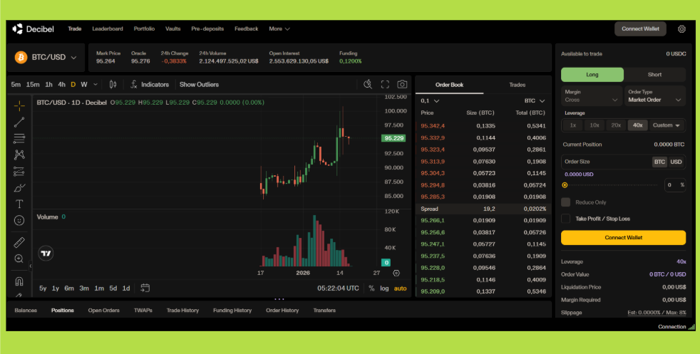 Decibel là nền tảng hạ tầng giao dịch on-chain được xây dựng trên blockchain Aptos, với mục tiêu tạo ra một động cơ giao dịch tiêu chuẩn cho DeFi, tương tự vai trò của các hệ thống trading trong tài chính truyền thống nhưng vận hành hoàn toàn trên blockchain.