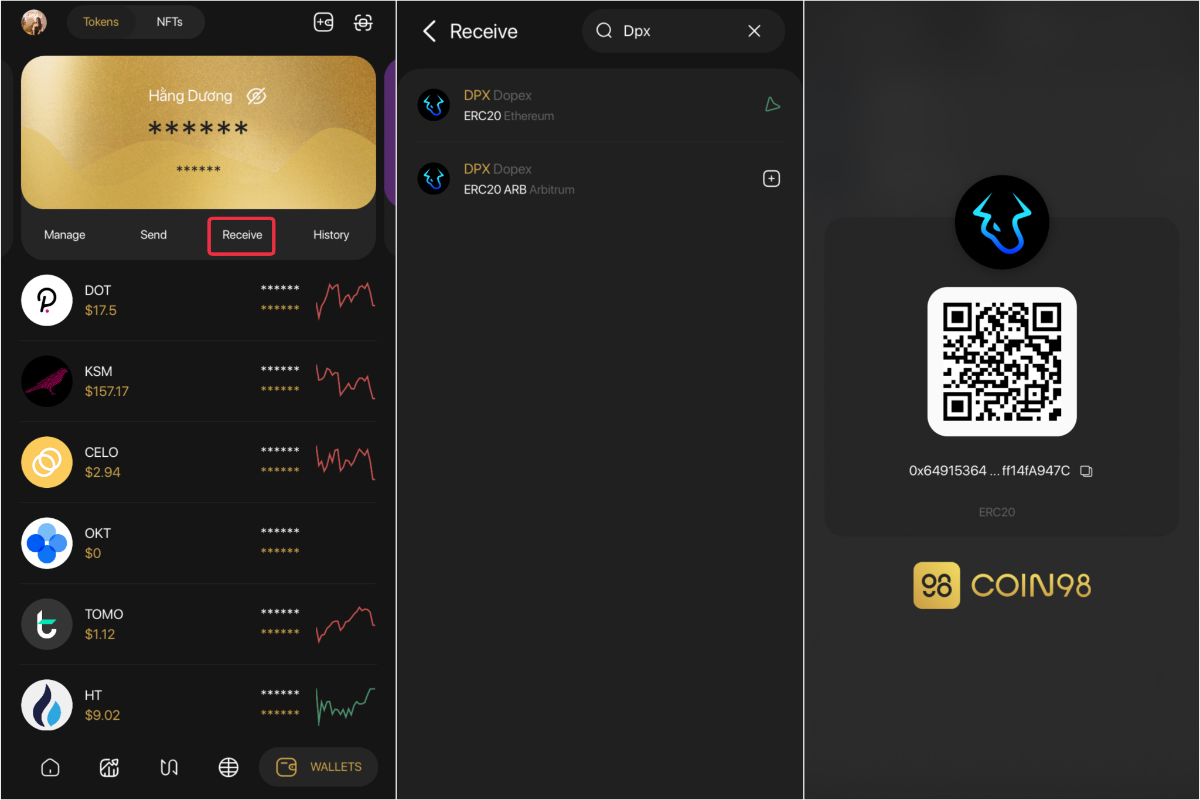 DPX token là ERC-20 token, anh em có thể lưu trữ trên Coin98 Wallet với thao tác đơn giản sau: