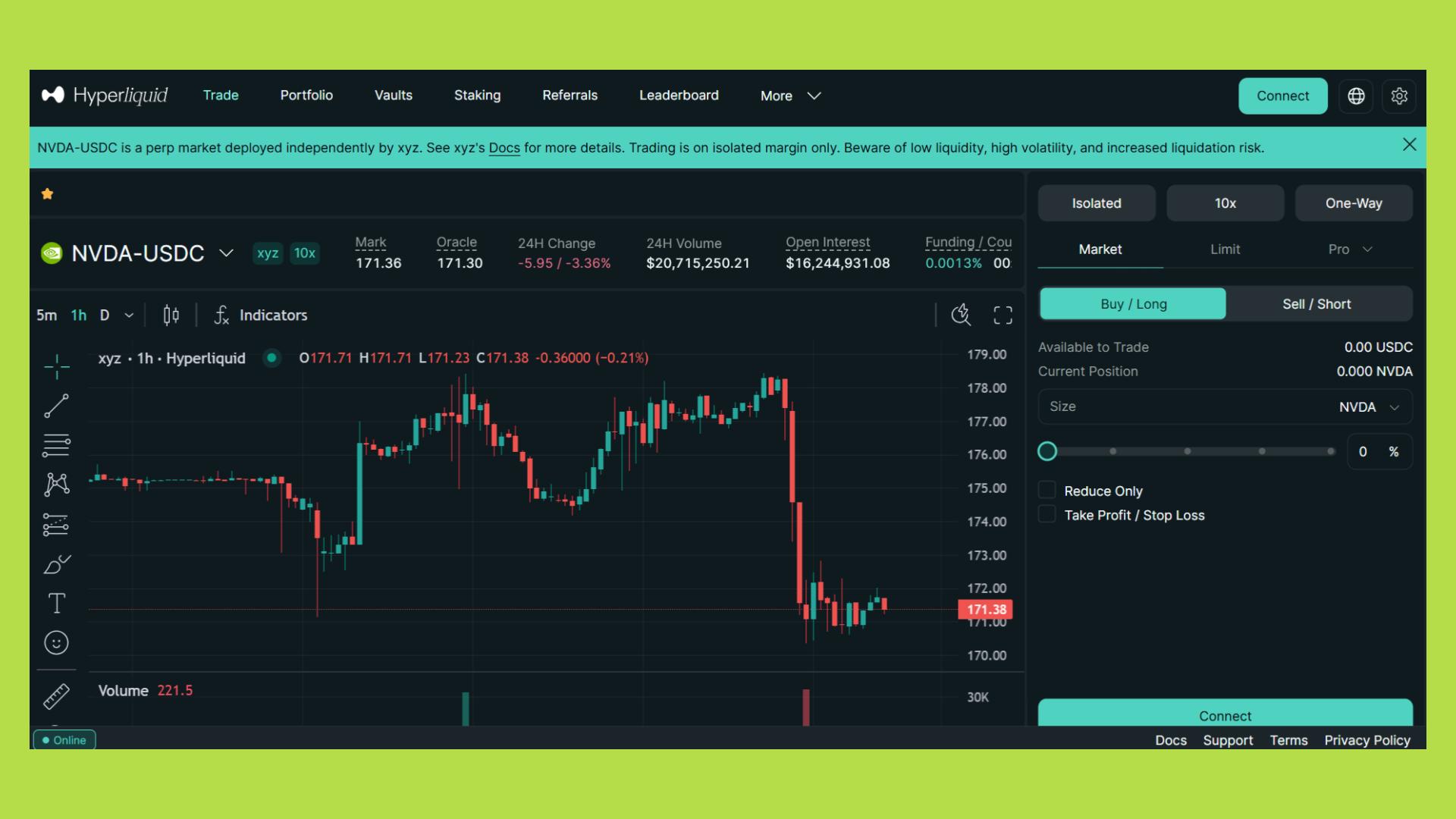 Equity perps cũng mang lại hiệu suất vốn vượt trội so với giao dịch cổ phiếu truyền thống. Thay vì cần 100% vốn để mua NVDA hay TSLA, trader chỉ cần một phần nhỏ ký quỹ nhưng vẫn có thể mở vị thế tương đương. Khả năng long/short linh hoạt giúp họ hedge danh mục một cách chủ động mà không cần bán cổ phiếu thật, rất phù hợp trong giai đoạn thị trường biến động.