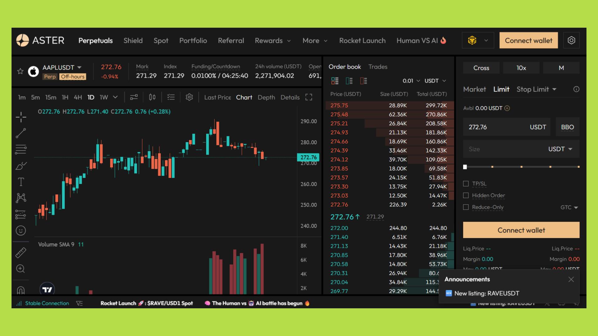 Equity Perpetuals (equity perps) là các hợp đồng phái sinh mô phỏng giá của một cổ phiếu trên sàn NASDAQ như AAPL (Apple), TSLA (Tesla) hay NVDA (Nvidia), cho phép trader giao dịch biến động giá cổ phiếu mà không cần sở hữu tài sản gốc.