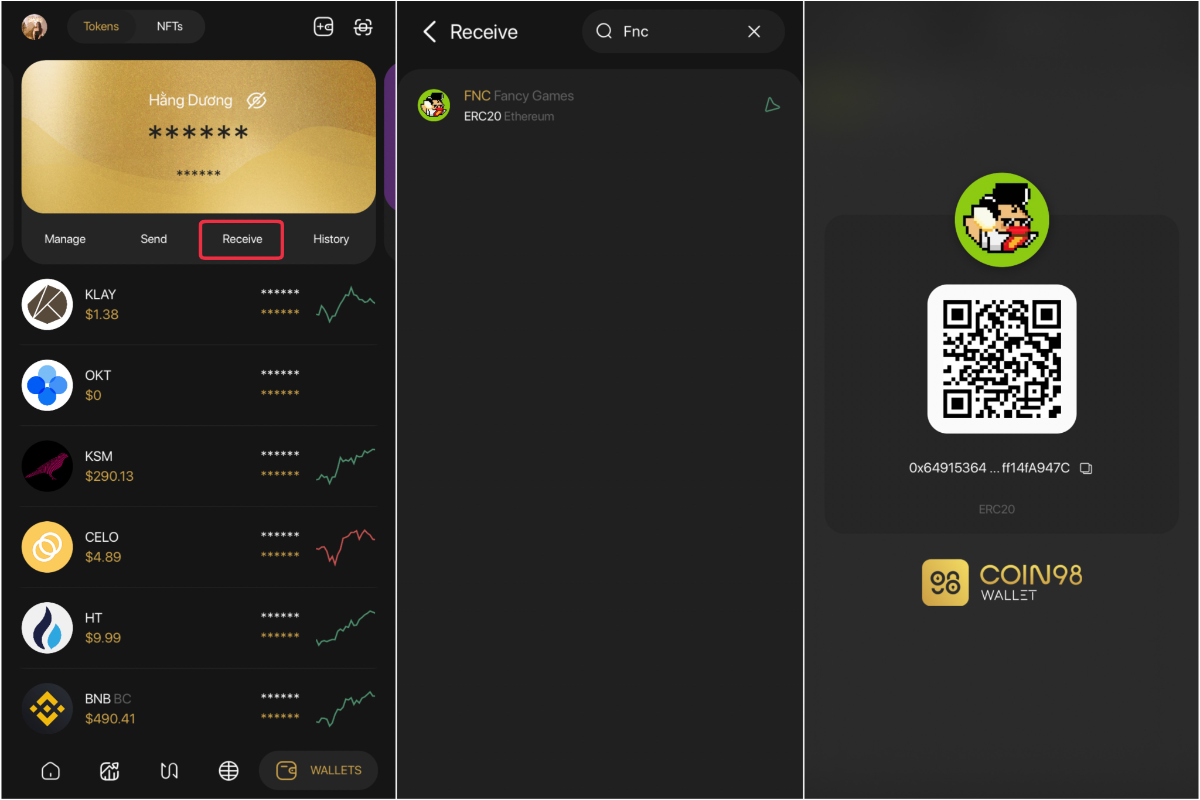 FNC token là ERC-20 token, anh em có thể lưu trữ trên Coin98 Wallet với thao tác đơn giản sau: