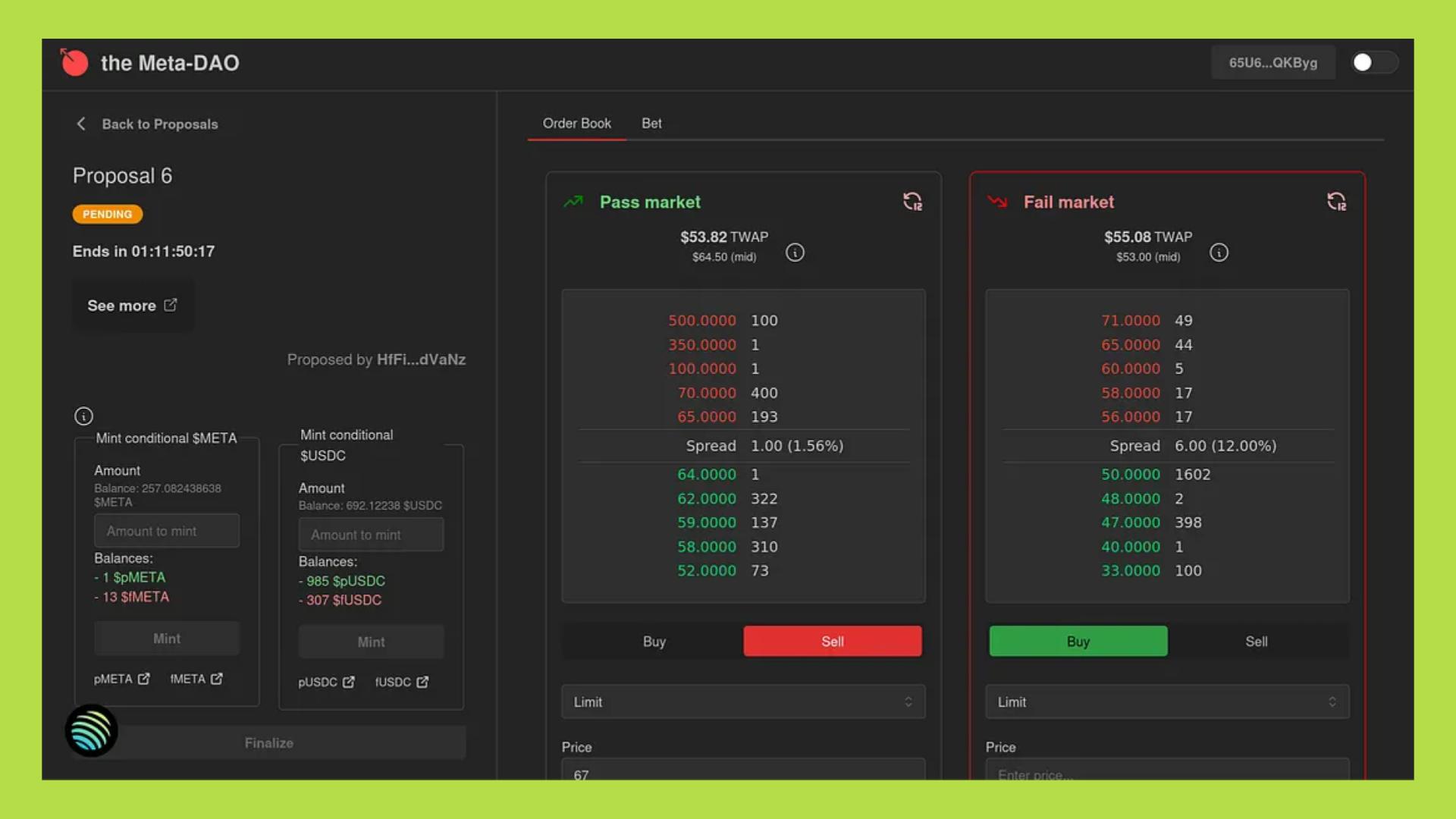 Trong thực tế, nhiều DAO nhỏ hoặc proposal ít được quan tâm có volume thấp, khiến giá dễ bị lệch và dễ bị thao túng ngắn hạn. Ngay cả tại MetaDAO, một số thị trường proposal chỉ đạt khối lượng vài trăm nghìn USD, chưa đủ mạnh để triệt tiêu hoàn toàn các hành vi pump/dump tạm thời. Bên cạnh đó, việc sử dụng các cấu trúc như CLOB cho thị trường pass/fail cũng làm tăng chi phí vận hành và yêu cầu kỹ thuật cao, khiến Futarchy khó triển khai rộng rãi.