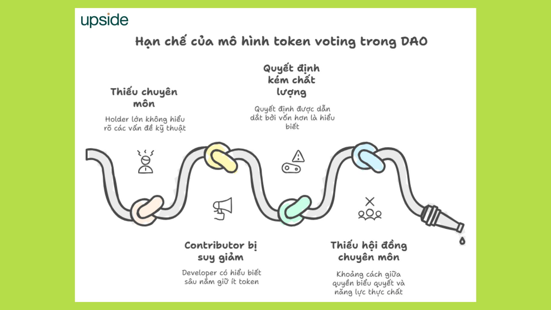 Ngược lại, nhiều DAO hiện nay lại đẩy hầu hết các quyết định, kể cả những vấn đề kỹ thuật phức tạp, về cho toàn bộ token holders thông qua bỏ phiếu. Trong khi đó, các contributor có hiểu biết sâu như developer hay researcher lại có thể nắm giữ rất ít token, khiến tiếng nói của họ trong governance bị suy giảm. Hệ quả là các quyết định quan trọng có nguy cơ được dẫn dắt bởi những người có vốn nhiều hơn là những người có hiểu biết, làm giảm chất lượng và tính bền vững của governance.