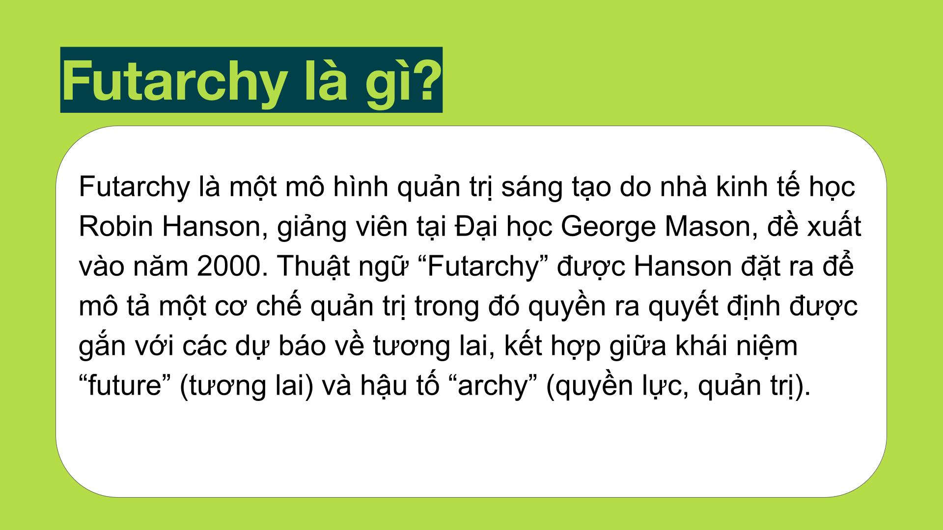Futarchy là mô hình quản trị sáng tạo do nhà kinh tế học Robin Hanson, giảng viên tại Đại học George Mason, đề xuất vào năm 2000. Thuật ngữ “Futarchy” được Hanson đặt ra để mô tả một cơ chế quản trị trong đó quyền ra quyết định được gắn với các dự báo về tương lai, kết hợp giữa khái niệm “future” (tương lai) và hậu tố “archy” (quyền lực, quản trị).