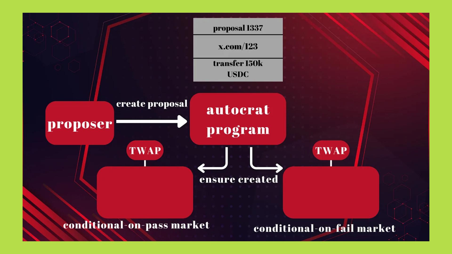 Về quy trình vận hành, bất kỳ ai cũng có thể đề xuất proposal cụ thể cho DAO (như phân bổ treasury, cấp grant hay thanh lý tài sản) thông qua chương trình Autocrat, kèm theo mô tả và mô hình tài chính dự đoán tác động đến giá META, mà không cần phê duyệt ban đầu. Sau đó, hệ thống tự động tạo hai prediction markets có điều kiện: PASS và FAIL, nơi người tham gia giao dịch bằng META hoặc USDC, với giá được tổng hợp bằng TWAP oracle để giảm nhiễu ngắn hạn. Cuối cùng, kịch bản nào có giá TWAP cao hơn (vượt ngưỡng quy định) sẽ trở thành khuyến nghị chính sách, và proposal tương ứng được tự động thực thi on-chain.