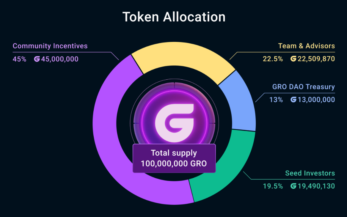 - Incentives: GRO sẽ được phân phối như một động lực bổ sung cho cộng đồng để cung cấp thanh khoản thông qua các nhóm staking và các chương trình cộng đồng khác nhau.
