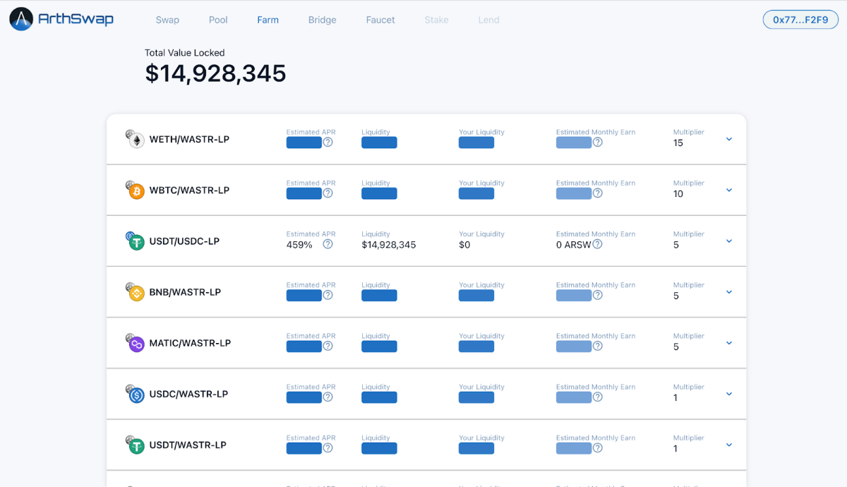 - ArthSwap: Phiên bản fork Uniswap V2, hiện tại token chưa được launch nhưng farming đang được launch trước khi token launch, với giả định giá token dự án ARSW là 0.175 đô. TVL hiện tại đang là 15 triệu đô. Dự án có sản phẩm giống PancakeSwap ở các khâu Swap, Liquidity Providing, Liquidity Mining, Staking, và tương lai sẽ phát triển giống Trader Joe trên Avalanche. Hiện tại đây đang là DEX lớn nhất trên Astar Network. Dự án đã được nhận đầu tư 1.5 triệu đô seed round từ DFG, LongHash Ventures, và Next Web Capital.