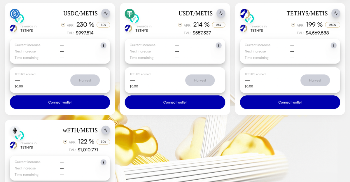 Tethys Finance: DEX trên Metis với 11 triệu đô TVL. Các pool farm trên DEX này đã được mở một lần và hiện tại không còn quá hấp dẫn. Lượng volume nằm ở khoảng 15 - 30% lượng TVL.