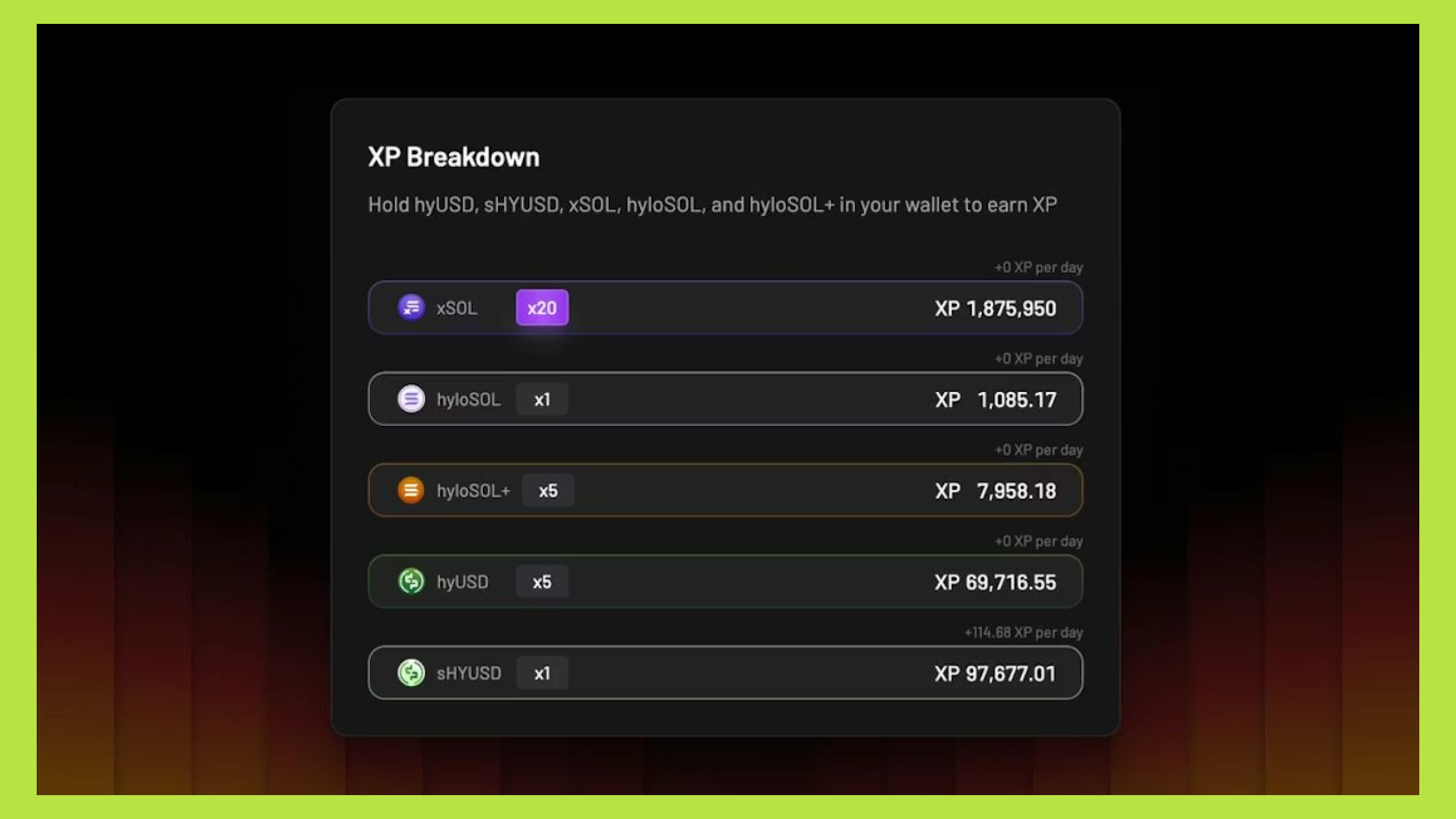 Trong giai đoạn này, XP được tính thông qua ba loại tài sản khác nhau, mỗi loại có mức điểm thưởng riêng. Giữ xSOL mang lại hệ số cao nhất, tiếp theo là hyUSD và cuối cùng là shyUSD phiên bản staking của stablecoin.