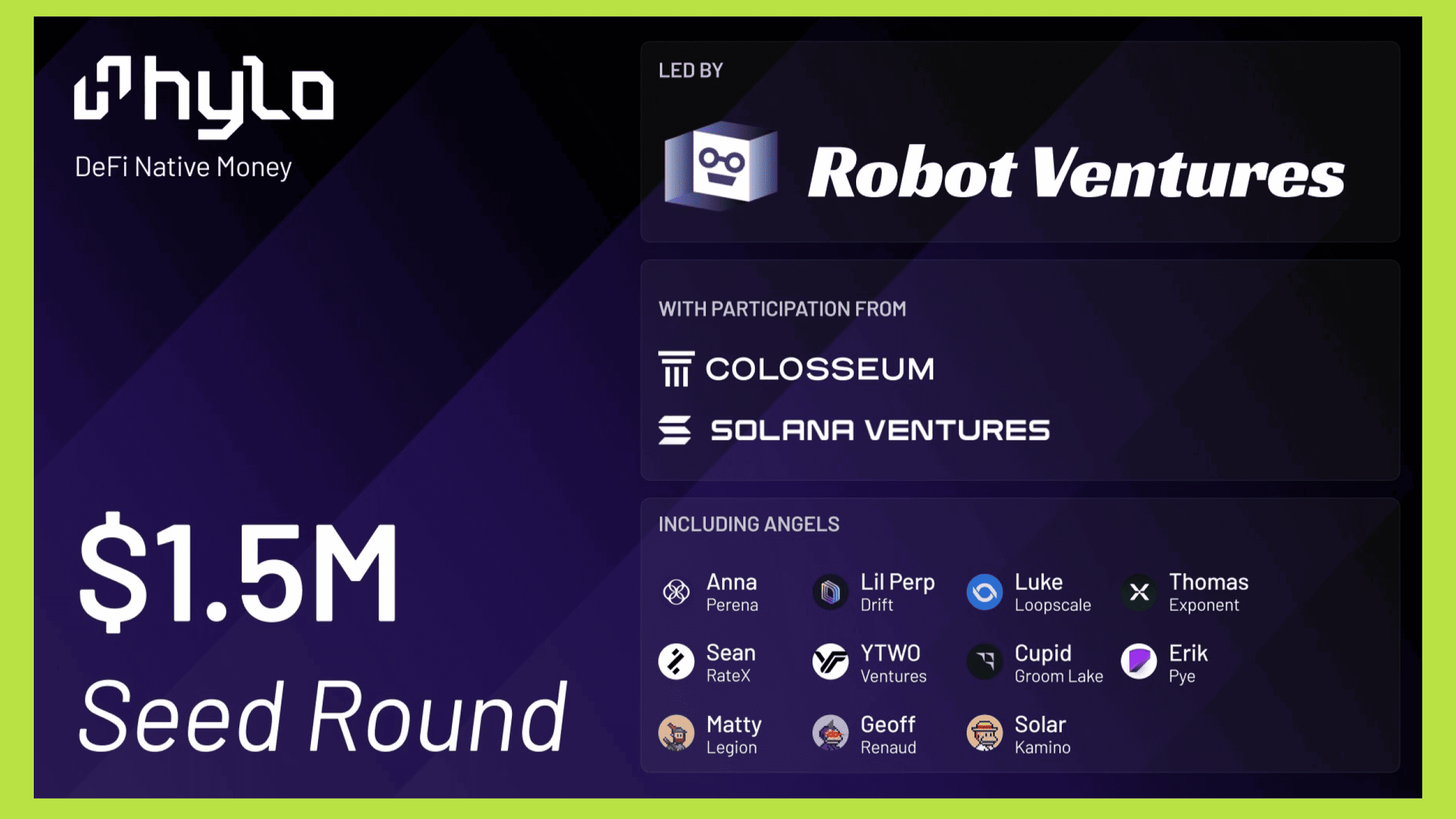 Hylo đã trải qua hai vòng gọi vốn. Vào tháng 11/2024, dự án hoàn thành vòng Incubation và huy động được 250,000 USD từ Colosseum. Đến tháng 8/2025, Hylo tiếp tục gọi vốn thành công 1.5 triệu USD trong vòng Seed do Robot Ventures dẫn dắt, cùng sự tham gia của Solana Ventures, Colosseum, YTWO, Anna Yuan, Geoff Renaud và một số nhà đầu tư khác.