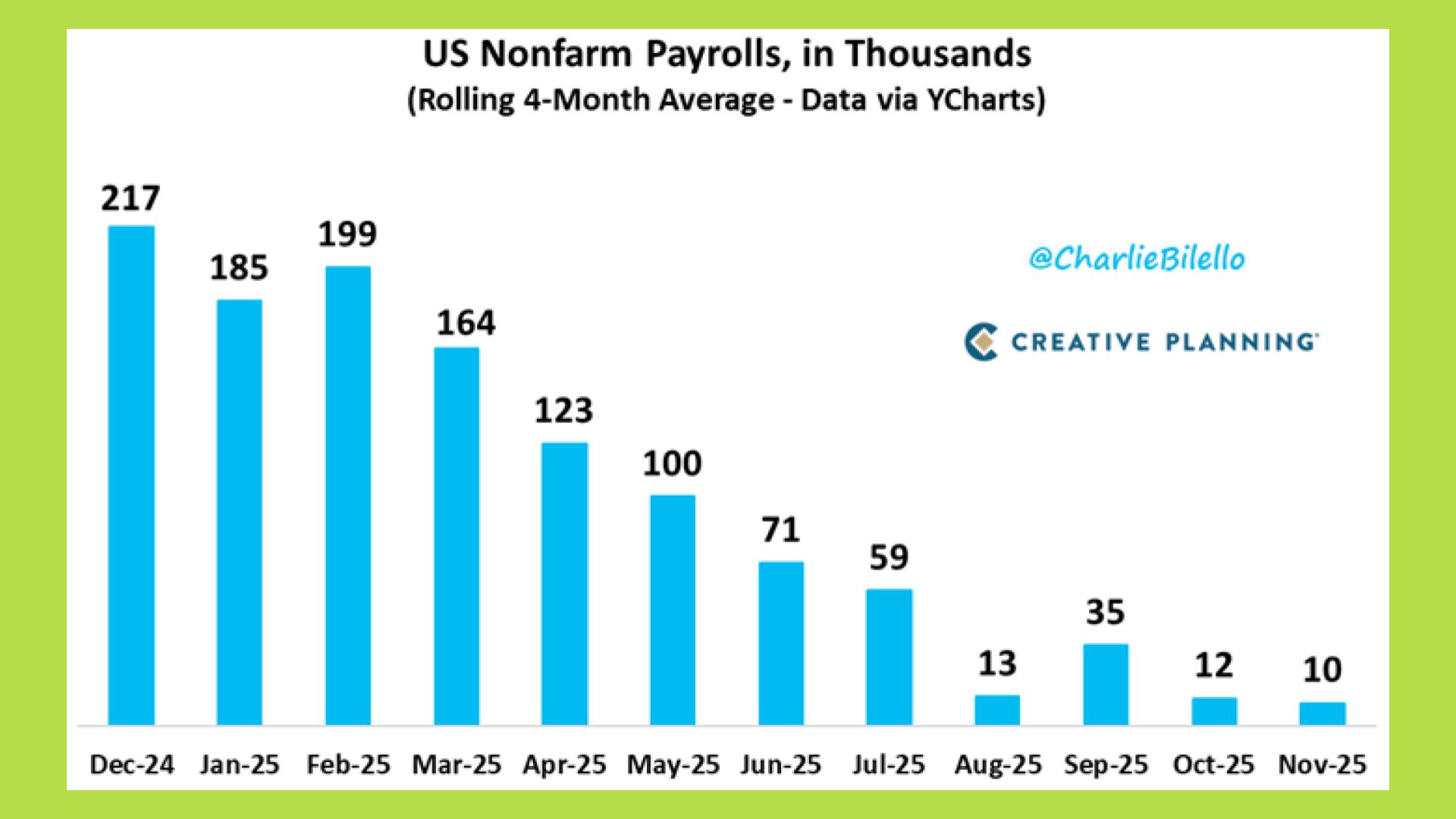 Thị trường lao động là nơi phản ánh rõ nhất trạng thái “nửa vời” của nền kinh tế Mỹ hiện tại. Các số liệu gần đây cho thấy đà tạo việc làm đã suy yếu rõ rệt. Trong bốn tháng gần nhất, nền kinh tế Mỹ chỉ tạo thêm trung bình khoảng 10,000 việc làm mỗi tháng, mức thấp nhất kể từ giai đoạn suy thoái năm 2020.