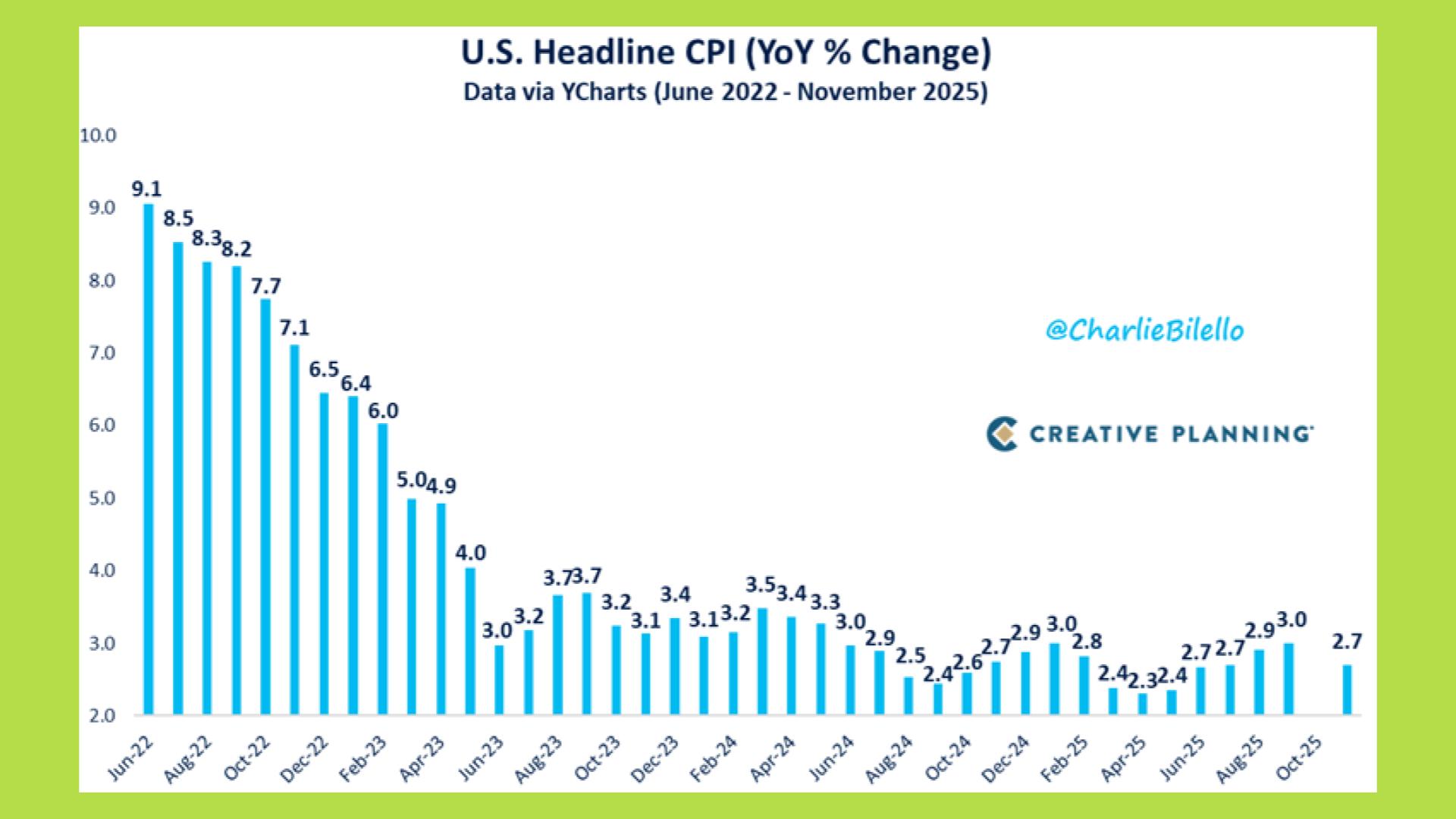 Lạm phát là mảnh ghép thứ hai làm bức tranh vĩ mô trở nên khó đọc. Việc chỉ số giá tiêu dùng giảm xuống 2.7% trong tháng gần nhất dễ tạo cảm giác rằng áp lực giá cả đã được kiểm soát và nền kinh tế đang đi đúng hướng. Trong bối cảnh lạm phát từng là rủi ro lớn nhất của thị trường suốt nhiều năm, con số này mang ý nghĩa tâm lý rất lớn.