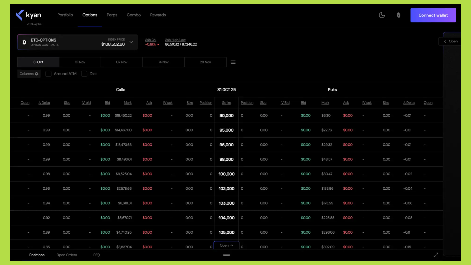 Kyan Exchange là sàn giao dịch phái sinh phi tập trung trên Arbitrum, được thiết kế chuyên biệt cho các sản phẩm Options (Quyền chọn) và Perpetual Futures (Hợp đồng tương lai vĩnh cửu) trực tiếp trên chuỗi.