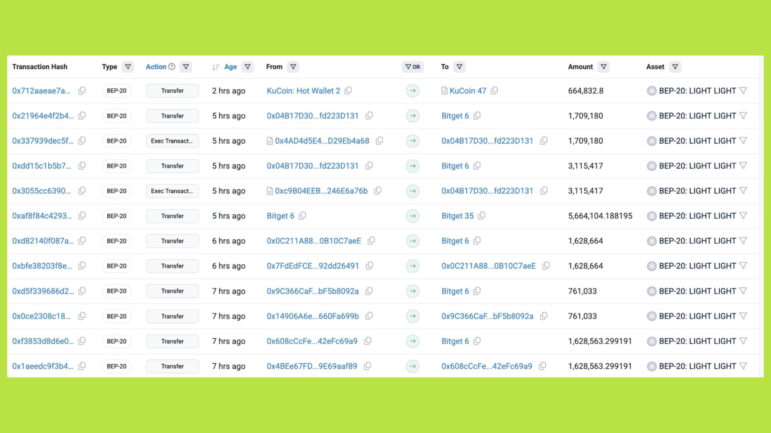 Theo dữ liệu ghi nhận, ví CFE5, một địa chỉ từng nhận LIGHT trực tiếp từ team, đã gửi khoảng 6.4 triệu USD giá trị LIGHT lên Bitget trong thời gian ngắn. Trước đó chỉ hai ngày, ví này cũng đã chuyển thêm khoảng 2.4 triệu USD lên sàn. Song song với các giao dịch này, một lượng xấp xỉ 2.4 triệu USD LIGHT khác được chuyển sang ví phụ 6491, cho thấy dấu hiệu chuẩn bị phân phối tiếp.