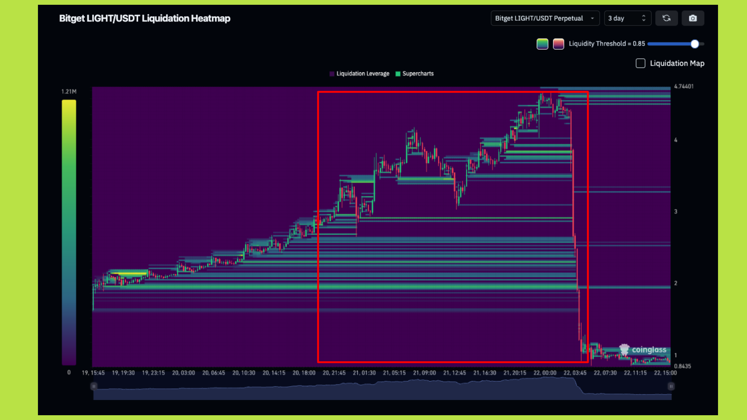Sau những đợt pump-dump, hệ quả thường thể hiện rõ nhất trên thị trường phái sinh. Khi giá LIGHT đã tăng hơn 5 lần trong thời gian ngắn, các vị thế long được mở với mật độ cao, khiến cấu trúc thị trường trở nên nhạy cảm hơn trước những biến động bất lợi. Khi nhịp giảm mạnh bắt đầu, nhiều vị thế long buộc phải đóng trong thời gian ngắn, làm suy yếu lực nâng giá và khiến thị trường nhanh chóng rơi vào trạng thái thiếu cân bằng.